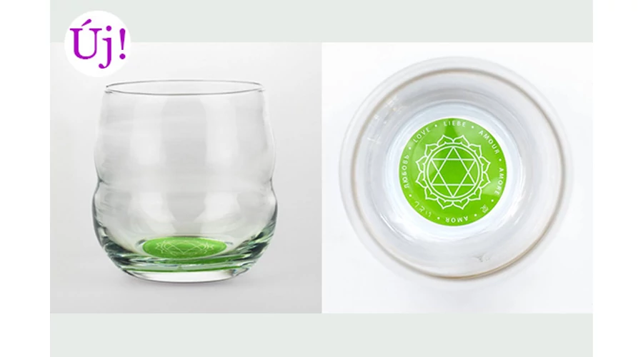 A Mythos Szívcsakra pohár alján (beleégetve) megtalálható a szívcsakra szimbóluma, megerősítő kifejezése (SZERETET) és színe (zöld).